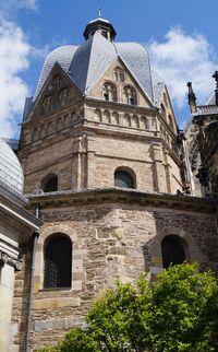 Few large stone buildings were constructed between the Constantinian basilicas of the 4th and 8th centuries, although many smaller ones were built during the 6th and 7th centuries. By the beginning of the 8th century, the Carolingian Empire revived the basilica form of architecture.[139] One feature of the basilica is the use of a transept,[140] or the "arms" of a cross-shaped building that are perpendicular to the long nave.[141] Other new features of religious architecture include the crossing tower and a monumental entrance to the church, usually at the west end of the building.[142]