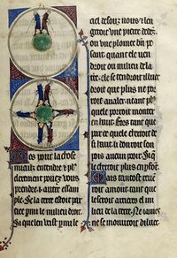 Chivalry and the ethos of courtly love developed in royal and noble courts. This culture was expressed in the vernacular languages rather than Latin and comprised poems, stories, legends, and popular songs spread by troubadours or Minnesängers, or wandering minstrels. Often the stories were written down in the chansons de geste, or "songs of great deeds", such as The Song of Roland or The Song of Hildebrand.[228] Secular and religious histories were also produced.[229] Geoffrey of Monmouth (d. c. 1155) composed his Historia Regum Britanniae, a collection of stories and legends about Arthur.[230] Other works were more clearly history, such as Otto von Freising's (d. 1158) Gesta Friderici Imperatoris detailing the deeds of Emperor Frederick Barbarossa, or William of Malmesbury's (d. c. 1143) Gesta Regum on the kings of England.[229]