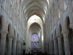 From the early 12th century, French builders developed the Gothic style, marked by the use of rib vaults, pointed arches, flying buttresses, and large stained glass windows. It was used mainly in churches and cathedrals and continued until the 16th century in much of Europe. Classic examples of Gothic architecture include Chartres Cathedral and Reims Cathedral in France, as well as Salisbury Cathedral in England.[252] Stained glass became a crucial element in the design of churches, which continued to use extensive wall-paintings, now almost all lost.[253]