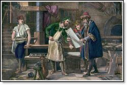 The publication of vernacular literature increased, with Dante (d. 1321), Petrarch (d. 1374) and Giovanni Boccaccio (d. 1375) in 14th-century Italy, Geoffrey Chaucer (d. 1400) and William Langland (d. c. 1386) in England, and François Villon (d. 1464) and Christine de Pizan (d. c. 1430) in France. Much literature remained religious, and although a great deal of it continued to be written in Latin, a new demand developed for saints' lives and other devotional tracts in the vernacular languages.[311] This was fed by the growth of the Devotio Moderna movement, most prominently in the formation of the Brethren of the Common Life, but also in the works of German mystics such as Meister Eckhart and Johannes Tauler (d. 1361).[313] Theatre also developed in the guise of miracle plays put on by the Church.[311] At the end of the period, the development of the printing press by Johannes Gutenberg in about 1450 led to the establishment of publishing houses throughout Europe by 1500.[314]