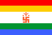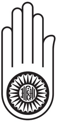 The hand with a wheel on the palm symbolizes ahimsā. The wheel represents the dharmachakra, which stands for the resolve to halt the saṃsāra (wandering) through the relentless pursuit of ahimsā. The five colours of the Jain flag represent the Pañca-Parameṣṭhi and the five vows.[301] The swastika's four arms symbolise the four realms in which rebirth occurs according to Jainism: humans, heavenly beings, hellish beings and non-humans.[302][303] The three dots on the top represent the three jewels mentioned in ancient texts: correct faith, correct understanding and correct conduct, believed to lead to spiritual perfection.[304]