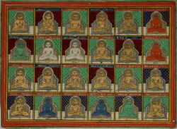 The Jain tower in Chittor, Rajasthan, is a good example of Jain architecture.[263] Decorated manuscripts are preserved in Jain libraries, containing diagrams from Jain cosmology.[264] Most of the paintings and illustrations depict historical events, known as Panch Kalyanaka, from the life of the tirthankara. Rishabha, the first tirthankara, is usually depicted in either the lotus position or kayotsarga, the standing position. He is distinguished from other tirthankara by the long locks of hair falling to his shoulders. Bull images also appear in his sculptures.[265] In paintings, incidents from his life, like his marriage and Indra marking his forehead, are depicted. Other paintings show him presenting a pottery bowl to his followers; he is also seen painting a house, weaving, and being visited by his mother Marudevi.[266] Each of the twenty-four tirthankara is associated with distinctive emblems, which are listed in such texts as Tiloyapannati, Kahavaali and Pravacanasaarodhara.[267]