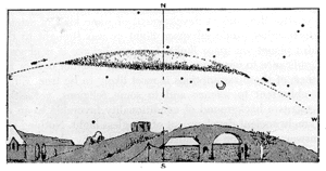 The most unusual phenomenon of the auroral storm, witnessed from Europe at approximately 6 p.m. on November 17, was described in detail in various ways, including as a "beam", "spindle", "definite body" with a "Zeppelin"-like shape and pale green colour, passing from horizon to horizon above the Moon.[7] The phenomenon, which transited the sky in approximately seventy-five seconds, was witnessed and documented by the amateur scientist and astronomer, John Rand Capron, at Guildown, Surrey. Capron made a drawing of what he referred to as the "auroral beam"; it subsequently was published along with an article in the Philosophical Magazine.[1] In the article, Capron collected twenty-six separate accounts, of which the majority came from the United Kingdom : these included reports of the object's torpedo-shaped appearance and an apparent dark nucleus.[7] Several of Capron's correspondents speculated that the phenomenon might have been a meteor, but Capron (and Maunder, who wrote a note in The Observatory on Capron's study) thought it could have represented a transient illumination of an otherwise invisible auroral arc.[8]
