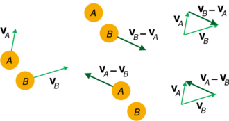 The relative velocity, denoted [math]\displaystyle{ \vec{v}_{B\mid A} }[/math] (also [math]\displaystyle{ \vec{v}_{BA} }[/math] or [math]\displaystyle{ \vec{v}_{B \operatorname{rel} A} }[/math]), is the velocity of an object or observer B in the rest frame of another object or observer A.