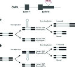The 3' untranslated region of this gene contains 5-37 copies of a CTG trinucleotide repeat. Expansion of this unstable motif to 50-5,000 copies causes myotonic dystrophy type I, which increases in severity with increasing repeat element copy number. Repeat expansion is associated with condensation of local chromatin structure that disrupts the expression of genes in this region. As the DMPK repeat is replicated, the hairpin loop that is formed leads to repeat expansion (a) or contractions (b).[3]