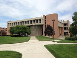 Central Campus features large lecture halls and classroom buildings. One of the most prominent is the 95,000 sq ft (9,000 m2) Olscamp Hall, which contains 28 classrooms and lecture halls capable of seating a total of 2,000 students. Others include Business Administration, Education, Math/Science and the Eppler Complex, home to the Sport Management department. Anderson Arena is a 5,000-seat arena, current home for BGSU women's gymnastics and former home of BGSU men's and women's basketball and volleyball. Memorial Hall is connected to Anderson and houses the college's ROTC programs.[92] Jerome Library is the main library on campus and the second tallest building at nine stories. Conklin North is another residence hall in the central portion of campus.[93] Oak Grove Cemetery is located in the north-central portion of campus.[94] Bowling Green State University opened the Falcon health center in 2013, after demolishing the Popular Culture building in 2012.[95] The Falcon Health Center is located across Wooster Street from the Education Building.[96] The Health and Human Services building is located near the Library.[97]