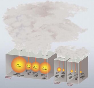 Large, explosive volcanic eruptions inject water vapor (H2O), carbon dioxide (CO2), sulfur dioxide (SO2), hydrogen chloride (HCl), hydrogen fluoride (HF) and ash (pulverized rock and pumice) into the stratosphere to heights of 16–32 kilometres (9.9–19.9 mi) above the Earth's surface. The most significant impacts from these injections come from the conversion of sulfur dioxide to sulfuric acid (H2SO4), which condenses rapidly in the stratosphere to form fine sulfate aerosols. The SO2 emissions alone of two different eruptions are sufficient to compare their potential climatic impact.[16] The aerosols increase the Earth's albedo—its reflection of radiation from the Sun back into space—and thus cool the Earth's lower atmosphere or troposphere; however, they also absorb heat radiated up from the Earth, thereby warming the stratosphere. Several eruptions during the past century have caused a decline in the average temperature at the Earth's surface of up to half a degree (Fahrenheit scale) for periods of one to three years; sulfur dioxide from the eruption of Huaynaputina probably caused the Russian famine of 1601–1603.[17]