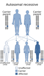 Autosomal recessive inheritance means the defective gene responsible for the disorder is located on an autosome, but two copies of the defective gene (one inherited from each parent) are required in order to be born with the disorder. The parents of an individual with an autosomal recessive disorder both carry one copy of the defective gene, but usually do not experience any signs or symptoms of the disorder.[citation needed]
