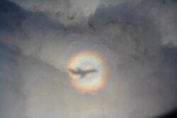 Depending on circumstances (such as the uniformity of droplet size in the clouds), one or more of the glory's rings can be visible. The rings are rarely complete, being interrupted by the shadow of the viewer.[1] The angular size of the inner and brightest ring is much smaller than that of a rainbow, about 5° to 20°, depending on the size of the droplets.[2] In the right conditions, a glory and a rainbow can occur simultaneously.[3]