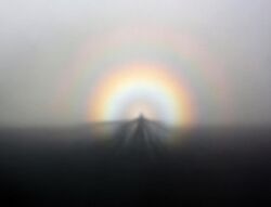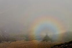 From Handwiki A glory is an optical phenomenon, resembling an iconic saint's halo around the shadow of the observer's head, caused by sunlight or (more rarely) moonlight interacting with the tiny water droplets that comprise mist or clouds. The glory consists of one or more concentric, successively dimmer rings, each of which is red on the outside and bluish towards the centre. Due to its appearance, the phenomenon is sometimes mistaken for a circular rainbow, but the latter has a much larger diameter and is caused by different physical processes.