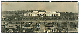 In 1926 Federal Parliament was to meet in Canberra and then in a "provisional" Parliament House (Old Parliament House), which was built on a flatter area than recommended in Griffin's plan. This building was officially opened on May 9, 1927. A few days earlier, the Prime Minister, Stanley Bruce, had begun occupying the official residence of the Prime Minister of Australia, The Lodge. At this stage, Canberra consisted of only two government office buildings, a Prime Minister's residence, several hotels and guest houses, a railway connection to Queanbeyan (and therefore Sydney), the Royal Military College, Duntroon, a hospital, a dam, a powerhouse, brickworks, a construction camp for workers and a nucleus of inner suburbs. By this time, some public servants had begun to move to Canberra from Melbourne, but the city’s population was only 7,000.