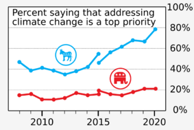 The sharp divide over the existence of and responsibility for global warming and climate change falls largely along political lines.[47]