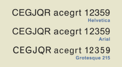 A comparison of Arial, Helvetica and Monotype Grotesque 215 scaled to equivalent cap height showing the most distinctive characters. Arial copies Helvetica's proportions and stroke width but has design detailing influenced by Grotesque 215.