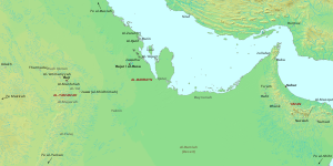 Gerrha and Uqair are archaeological sites on the eastern coast of the Arabian Peninsula, only 100 kilometres (60 miles) from the ancient burial grounds of Dilmun on the island of Bahrain.[33][34]