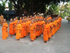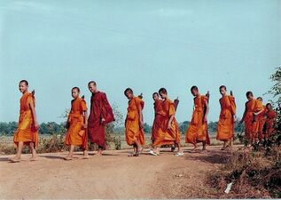 In Buddhism orange (or more precisely saffron) was the colour of illumination, the highest state of perfection.[37] The saffron colours of robes to be worn by monks were defined by the Buddhist texts. The robe and its colour is a sign of renunciation of the outside world and commitment to the order. The candidate monk, with his master, first appears before the monks of the monastery in his own clothes, with his new robe under his arm and asks to enter the order. He then takes his vows, puts on the robes, and with his begging bowl, goes out to the world. Thereafter, he spends his mornings begging and his afternoons in contemplation and study, either in a forest, garden, or in the monastery.[38]