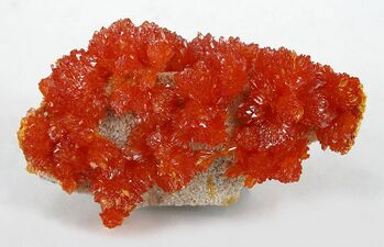 A sample of crocoite crystals from Dundas extended mine in Tasmania. Discovered in 1797 by the French chemist Louis Vauquelin, it was used to make the first synthetic orange pigment, chrome orange, used by Pierre-Auguste Renoir and other painters.