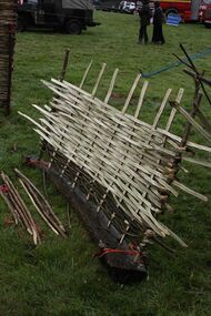 The construction of wattles starts with the uprights, whether they are set into a frame or placed into the ground. Starting at the bottom, flexible willow shoots, called withies, are woven in and out of the uprights (staves).