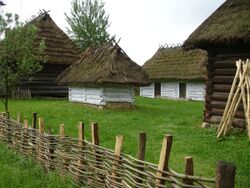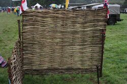 In England the Romans used wattlework for various purposes, as for the lining of wells, as at Caersws. ... In these Romano-British examples the wattling does not appear to have been in frames, as the rounded daubing of the ends of the wattling was found. Apparently the ends of the wattle stakes were merely driven into the ground without a sill ... Probably the ends of the Romano-British wattles were formed in the same manner as are hurdles in West Surrey to-day. The hurdle maker uses a 'hurdle frame,' a long shaped block slightly curved to hold the feet of the uprights, which are round rods; 'the man then weaves in horizontally the smaller split rods till he has filled up the hurdle. When he comes to either end he gives the rod a clever twist that opens the fibres and gives it something the character of a rope, so that it passes tough-stranded and unbroken round the end uprights.' When the twigs or wattles had been interwoven with the posts the hurdle became one homogenous whole.[1]