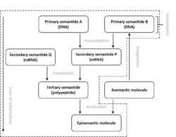 Molecules that are not produced by an organism are referred to as asemantic molecules, because they do not contain any genetic information. Asementic molecules may be changed into episemantic molecules by anabolic processes. Asemantic molecules may also become semantic molecules when they integrate into a genome. Certain viruses and episomes have this ability.[1]