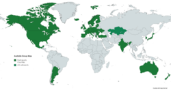 The group, initially consisting of 15 members, held its first meeting in Brussels, Belgium, in June 1985.[2] With the incorporation of India on January 19, 2018, it now has 43 members,[3] including Australia , New Zealand, the European Commission, all 27 member states of the European Union, United Kingdom , the United States , Canada , India , Ukraine , and Argentina . The name comes from Australia's initiative to create the group. Australia manages the secretariat.