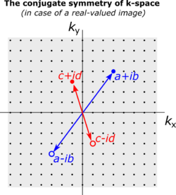 where the star ([math]\displaystyle{ ^* }[/math]) denotes complex conjugation. Thus k-space information is somewhat redundant then, and an image can be reconstructed using only one half of the k-space, either in the PE (Phase Encode) direction saving scan time (such a technique is known as half Fourier or half scan) or in the FE (Frequency Encode) direction, allowing for lower sampling frequencies and/or shorter echo times (such a technique is known as half echo). However, these techniques are approximate due to phase errors in the MRI data which can rarely be completely controlled (due to imperfect static field shim, effects of spatially selective excitation, signal detection coil properties, motion etc.) or nonzero phase due to just physical reasons (such as the different chemical shift of fat and water in gradient echo techniques).