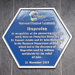 Although Boots no longer engages in drug discovery, Ibuprofen (iso-butyl-propanoic-phenolic acid) was created by a team of Boots scientists including Stewart Adams and John Nicholson.[2] In November 2013 work on ibuprofen was recognised by the erection of a Royal Society of Chemistry blue plaque on the site of the original laboratory where the painkiller was developed. The plaque reads:[3]