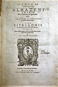 Ibn al-Haytham (known in Western Europe as Alhacen or Alhazen) (965-1040), often regarded as the "father of optics"[11] and a pioneer of the scientific method, formulated "the first comprehensive and systematic alternative to Greek optical theories."[12] He postulated in his "Book of Optics" that light was reflected upon different surfaces in different directions, thus causing different light signatures for a certain object that we see.[13] It was a different approach than that which was previously thought by Greek scientists, such as Euclid or Ptolemy, who believed rays were emitted from the eye to an object and back again. Al-Haytham, with this new theory of optics, was able to study the geometric aspects of the visual cone theories without explaining the physiology of perception.[7] Also in his Book of Optics, Ibn al-Haytham used mechanics to try and understand optics. Using projectiles, he observed that objects that hit a target perpendicularly exert much more force than projectiles that hit at an angle. Al-Haytham applied this discovery to optics and tried to explain why direct light hurts the eye, because direct light approaches perpendicularly and not at an oblique angle.[13] He developed a camera obscura to demonstrate that light and color from different candles can be passed through a single aperture in straight lines, without intermingling at the aperture.[14] His theories were transmitted to the West.[12] His work influenced Roger Bacon, John Peckham and Vitello, who built upon his work and ultimately transmitted it to Kepler.[12]