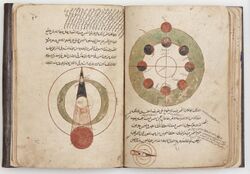 The Islamic understanding of the astronomical model was based on the Greek Ptolemaic system. However, many early astronomers had started to question the model. It was not always accurate in its predictions and was over complicated because astronomers were trying to mathematically describe the movement of the heavenly bodies. Ibn al-Haytham published Al-Shukuk ala Batiamyus ("Doubts on Ptolemy"), which outlined his many criticisms of the Ptolemaic paradigm. This book encouraged other astronomers to develop new models to explain celestial movement better than Ptolemy.[16] In al-Haytham's Book of Optics he argues that the celestial spheres were not made of solid matter, and that the heavens are less dense that air.[17] Al-Haytham eventually concludes that heavenly bodies follow the same laws of physics as earthly bodies.[18] Some astronomers theorized about gravity too, al-Khazini suggests that the gravity an object contains varies depending on its distance from the center of the universe. The center of the universe in this case refers to the center of the Earth.[19]
