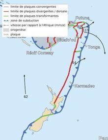 The subducting Pacific plate lies between 170 km (110 mi) to 450 km (280 mi) beneath the Havre Trough between 28°S to 35°S.[3] South of the Rapuhia Scarp at 35°S it is thought that the Hikurangi Plateau volcanics which are up to 15 km (9.3 mi) thick are subducting and this remnant of a Cretaceous Large Igneous Province changes erupted volcanic composition above it.[3]