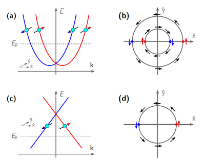 The origin of the Rashba–Edelstein effect relies on the presence of spin-split surface or interface states, which can arise for a structural inversion asymmetry or because the material exhibits a topologically protected surface, being a topological insulator.[1][7] In both cases, the material surface displays the spin polarization locked to the momentum, meaning that these two quantities are univocally linked and orthogonal one to the other (this is clearly visible from the Fermi countours).[1][7][9][10] It is worth noticing that also a bulk inversion asymmetry could be present, which would result in the Dresselhaus effect.[1] In fact, if, in addition to the spatial inversion asymmetry or to the topological insulator band structure, also a bulk inversion asymmetry is present, the spin and momentum are still locked but their relative orientation is not straightforwardly determinable (since also the orientation of the charge current with respect to the crystallographic axes plays a relevant role).[9] In the following discussion, the Dresselhaus effect will be neglected, for simplicity.[9]