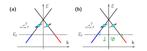 The topological insulator case is easier to visualize due to the presence of a single Fermi contour, therefore the topological insulator case is discussed first. Topological insulators display spin-split surface states where spin-momentum locking is present.[1][2][10] Indeed, when a charge current flows in the surface states of the topological insulator, it can also be seen as a well-defined momentum shift [math]\displaystyle{ \Delta k }[/math] in the reciprocal space, resulting in a different occupation of the spin-polarized branches of the Dirac cone.[1] This unbalance, accordingly to the structure of the topological insulator band dispersion relation, produces a spin accumulation in the investigated material, i.e., a charge-to-spin conversion occurs.[3] The spin accumulation is orthogonal to the injected charge current, accordingly to spin-momentum locking.[13] Due to the fact that these materials display a conductive behaviour on their surface while being insulating on their bulk, the charge current is only allowed to flow on the topological insulator surfaces: this is the origin of the bidimensionality of this charge-to-spin conversion mechanism.[1][14]