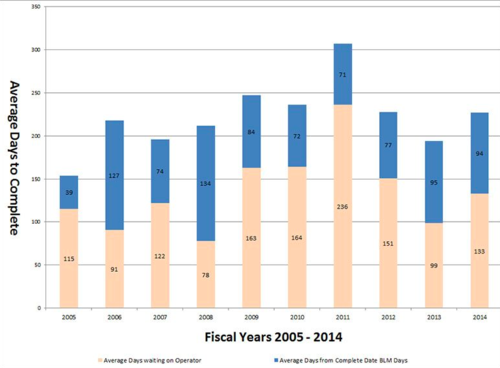 Before drilling can occur on federal lands, an Application for Permit to Drill (APD) must be submitted and approved by the U.S. Bureau of Land Management (BLM). In fiscal year (FY) 2014, the BLM approved 3,769 APDs. During that time, it took the BLM an average of 94 days to review an APD and it took oil and gas operators 133 days to resolve any issues the BLM found with the APD, according to the BLM. The table below shows drilling permits approved by fiscal year in Tennessee and adjacent states.[11][20]