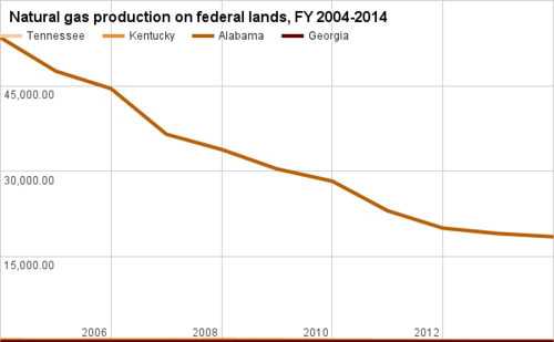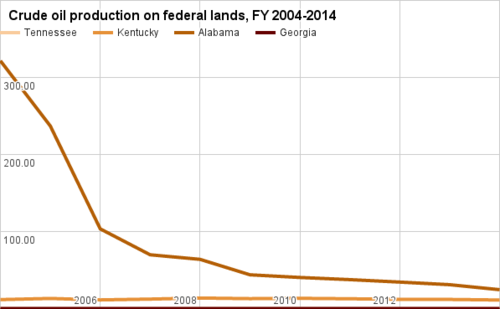 The Office of Natural Resources Revenue (ONRR) provides data on mineral production on federal lands. The charts and tables below show federal onshore oil and natural gas production (in terms of the amounts sold) for fiscal years 2004 to 2014 for Tennessee, its adjacent states (provided for comparison), and the United States as a whole.[22]