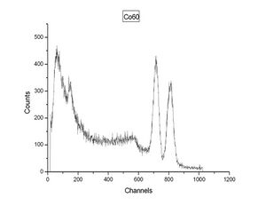 The gamma spectrum shown in Figure 2 is of the cobalt isotope 60Co, with two gamma rays with 1.17 MeV and 1.33 MeV respectively. (See the decay scheme article for the decay scheme of cobalt-60.) The two gamma lines can be seen well-separated; the peak to the left of channel 200 most likely indicates a strong background radiation source that has not been subtracted. A backscatter peak can be seen near channel 150, similar to the second peak in Figure 1.