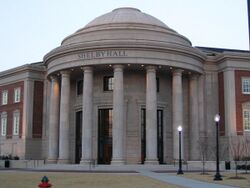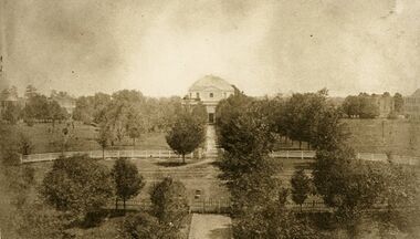 In 1818, the United States Congress authorized the newly created Alabama Territory to set aside a township for the establishment of a "seminary of learning". When Alabama was admitted to the United States of America on December 14, 1819, a second township was added to the land grant, bringing it to a total of 46,000 acres (186 km2). The General Assembly of Alabama established the seminary on December 18, 1820, named it "The University of the State of Alabama", and created a board of trustees to manage the construction and operation of the university.[2] The board selected a construction site and an architect to design the campus. The site the board chose was, at the time, outside the city limits of the erstwhile state capital, Tuscaloosa.[10] William Nichols, the architect of the Alabama State Capitol building and Christ Episcopal Church in Tuscaloosa, was chosen to design the campus. Influenced by Thomas Jefferson's plan at the University of Virginia, the Nichols-designed campus featured a 70-foot (21 m) wide, 70-foot (21 m) high domed Rotunda that served as the library and nucleus of the campus.[11]
