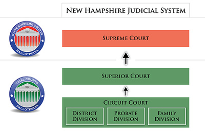 New Hampshire Supreme Court • New Hampshire Superior Courts • New Hampshire Circuit Courts • New Hampshire Probate Courts • New Hampshire District Court • New Hampshire Family Division