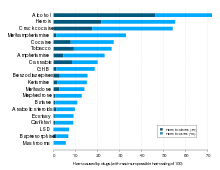 Results of the ISCD 2010 study ranking the levels of damage caused by drugs, in the opinion of drug-harm experts. When harm to self and others is summed, alcohol was the most harmful of all drugs considered, scoring 72%.