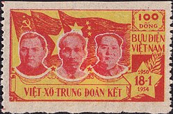 In February 1950, after the Battle of Route Coloniale 4 successfully removed the French border blockade, he met with Joseph Stalin and Mao Zedong in Moscow after the Soviet Union recognized his government. They all agreed that China would be responsible for backing the Việt Minh.[75] Mao Zedong's emissary to Moscow stated in August that China planned to train 60,000–70,000 Viet Minh shortly.[76] The road to the outside world was open for Việt Minh forces to receive additional supplies which would allow them to escalate the fight against the French regime throughout Indochina. At the outset of the conflict, Hồ reportedly told a French visitor: "You can kill ten of my men for every one I kill of yours. But even at those odds, you will lose and I will win".[77] In 1954, the First Indochina War came to an end after the decisive Battle of Dien Bien Phu, where more than 10,000 French soldiers surrendered to the Viet Minh. The subsequent Geneva Accords peace process partitioned North Vietnam at the 17th parallel.
