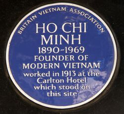 At various points from 1913 to 1919, Thành (Hồ) claimed to have lived in West Ealing and later in Crouch End, Hornsey. He reportedly worked as either a chef or dishwasher (reports vary) at the Drayton Court Hotel in West Ealing.[22] Claims that he was trained as a pastry chef under Auguste Escoffier at the Carlton Hotel in Haymarket, Westminster are not supported by documentary evidence.[23][24] However, the wall of New Zealand House, home of the New Zealand High Commission which now stands on the site of the Carlton Hotel, displays a blue plaque. During 1913, Thành was also employed as a pastry chef on the Newhaven–Dieppe ferry route.[25]