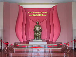 Hồ Chí Minh (胡志明) was born as Nguyễn Sinh Cung (阮生恭)[3][lower-alpha 5][4] in 1890 in the village of Làng Chùa or Hoàng Trù in Kim Liên commune, Nam Đàn district, Nghệ An province, in Central Vietnam which was then a French protectorate. Although 1890 is generally accepted as his birth year, at various times he used four other birth years:[13] 1891,[14] 1892,[lower-alpha 10] 1894[lower-alpha 11] and 1895.[15] He lived in his father Nguyễn Sinh Sắc's village of Làng Sen in Kim Liên until 1895 when his father sent him to Huế for study. He had three siblings: his sister Bạch Liên (Nguyễn Thị Thanh), a clerk in the French Army; his brother Nguyễn Sinh Khiêm (Nguyễn Tất Đạt), a geomancer and traditional herbalist; and another brother (Nguyễn Sinh Nhuận), who died in infancy. As a young child, Cung (Hồ) studied with his father before more formal classes with a scholar named Vuong Thuc Do. He quickly mastered Chữ Hán, a prerequisite for any serious study of Confucianism while honing his colloquial Vietnamese writing.[10]:21 In addition to his studies, he was fond of adventure and loved to fly kites and go fishing.[10]:21 Following Confucian tradition, his father gave him a new name at the age of 10: Nguyễn Tất Thành.