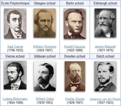 Historically, thermodynamics developed out of a desire to increase the efficiency of early steam engines, particularly through the work of French physicist Sadi Carnot (1824) who believed that engine efficiency was the key that could help France win the Napoleonic Wars.[1] Scots-Irish physicist Lord Kelvin was the first to formulate a concise definition of thermodynamics in 1854[2] which stated, "Thermo-dynamics is the subject of the relation of heat to forces acting between contiguous parts of bodies, and the relation of heat to electrical agency." German physicist and mathematician Rudolf Clausius restated Carnot's principle known as the Carnot cycle and gave to the theory of heat a truer and sounder basis. His most important paper, "On the Moving Force of Heat",[3] published in 1850, first stated the second law of thermodynamics. In 1865 he introduced the concept of entropy. In 1870 he introduced the virial theorem, which applied to heat.[4]