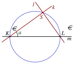In the figure, the points K and L are fixed points on a given line m. The line k is a variable line through K. The line l through L is perpendicular to k. The angle [math]\displaystyle{ \alpha }[/math] between k and m is the parameter.