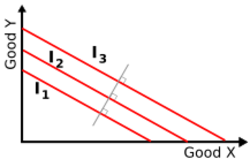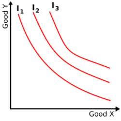 An indifference curve[20] is a graphical representation that shows the combinations of quantities of two goods for which an individual will have equal preference or utility. It is named as such because the consumer would be indifferent between choosing any combination or bundle of commodities.[21] An indifference curve can be detected in a market when the economics of scope is not overly diverse, or the goods and services are part of a perfect market. Any bundles on the same indifference curve have the same utility level. One example of this is deodorant. Deodorant is similarly priced throughout several different brands. Deodorant also has no major differences in use; therefore, consumers have no preference in what they should use. Indifference curves are negatively sloped because of the non-satiation of preferences, as consumers cannot be indifferent between two bundles if one has more of both goods. The indifference curves are also curved inwards due to diminishing marginal utility, i.e., the reduction in the utility of every additional unit as consumers consume more of the same good. The slope of the indifference curve measures the marginal rate of substitution, which can be defined as the number of units of one good needed to replace one unit of another good without changing the overall utility.[22]