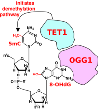 When OGG1 is present at an oxidized guanine within a methylated CpG site it recruits TET1 to the 8-OHdG lesion (see Figure). This allows TET1 to demethylate an adjacent methylated cytosine. Demethylation of cytosine is an epigenetic alteration.Lua error: Internal error: The interpreter exited with status 1.