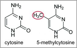DNA methylation frequently occurs in repeated sequences, and helps to suppress the expression and mobility of 'transposable elements':[38] Because 5-methylcytosine can be spontaneously deaminated (replacing nitrogen by oxygen) to thymidine, CpG sites are frequently mutated and become rare in the genome, except at CpG islands where they remain unmethylated. Epigenetic changes of this type thus have the potential to direct increased frequencies of permanent genetic mutation. DNA methylation patterns are known to be established and modified in response to environmental factors by a complex interplay of at least three independent DNA methyltransferases, DNMT1, DNMT3A, and DNMT3B, the loss of any of which is lethal in mice.[39] In invertebrate of social honey bees, main enzymes are DNMT1 and DNMT3.[40] DNMT1 is the most abundant methyltransferase in somatic cells,[41] localizes to replication foci,[42] has a 10–40-fold preference for hemimethylated DNA and interacts with the proliferating cell nuclear antigen (PCNA).[43]