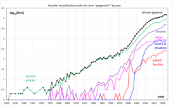 The term epigenesis has a generic meaning of "extra growth" that has been used in English since the 17th century.[10] In scientific publications, the term epigenetics started to appear in the 1930s (see Fig. on the right). However, its contemporary meaning emerged only in the 1990s.[11]