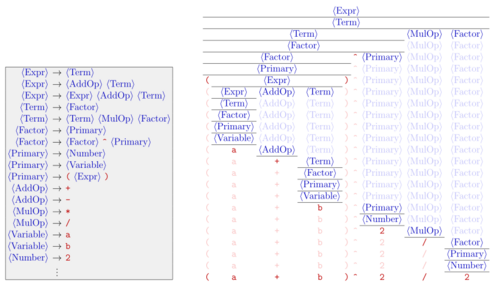 Simplified formal grammar for arithmetitical expressions in a programming language (left),[43] and derivation of the example expression (a+b)^2/2(right). The latter corresponds to a hierarchical structure ("syntax tree") which is unique for the given expression. The compiler generates machine code from the tree in such a way that operations originating at the lowest hierarchy level are executed first.