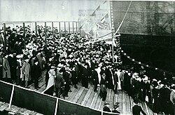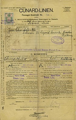 In September 1909, Mauretania captured the Blue Riband for the fastest westbound crossing—a record that was to stand for more than two decades.[1] In December 1911, as in New York City in December 1910, Mauretania broke loose from her moorings while in the River Mersey and sustained damage that caused the cancellation of her special speedy Christmas voyage to New York. In a quick change of events Cunard rescheduled Mauretania's voyage for Lusitania, which had just returned from New York, under the command of Captain James Charles. Lusitania completed Christmas crossings for Mauretania,[28] carrying travellers back to New York. Mauretania was on a westbound voyage from Liverpool to New York, beginning 10 April 1912, and was docked at Queenstown, Ireland, at the time of the RMS Titanic disaster. Mauretania was transporting Titanic's cargo manifest carried by registered mail. Traveling on Mauretania at the time was the chairman of Cunard, A. A. Booth, who organised a vigil for the Titanic victims.[29] In the spring of 1913 westbound transatlantic passage aboard Mauretania cost roughly $17 for third class passengers, as shown in the original ticket at right.[citation needed]