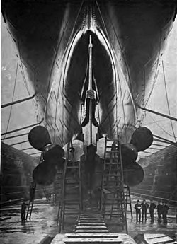 Heavy vibrations as a by-product of the four steam turbines on Lusitania and Mauretania plagued both ships throughout their careers. When Lusitania sailed at top speed the vibrations were so severe that Second and Third Class sections of the ship could become uninhabitable.[20] In contrast, the Olympic-class liners chose economy over speed by installing two traditional reciprocating engines and a turbine for the central propeller. With their greater tonnage and wider beam, the Olympic-class liners were also more stable at sea and less prone to rolling. Lusitania and Mauretania both featured straight prows in contrast to the angled prows of the Olympic liners. Designed so that the ships could plunge through a wave rather than crest it, the unforeseen consequence was that the Cunard liners would pitch forward alarmingly, even in calm weather, allowing huge waves to splash the bow and forward part of the superstructure.[21]