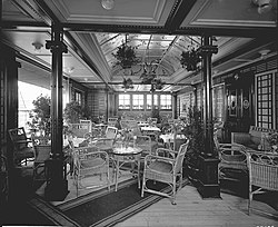 Mauretania was designed to suit Edwardian tastes. The ship's interior was designed by the architect Harold Peto, and her public rooms were fitted out by two notable London design houses – Ch. Mellier & Sons and Turner and Lord,[16][17] with twenty-eight different types of wood, along with marble, tapestries, and other furnishings such as the stunning octagon table in the smoking room.[16][18] Wood panelling for her first class public rooms was supposedly carved by three hundred craftsmen from Palestine but this seems unlikely, unnecessary and was probably executed by the yard or subcontracted, as were the majority of the second and third class areas.[19] The multi-level first-class dining saloon of straw oak was decorated in Francis I style and topped by a large dome skylight.[18] A series of elevators, then a rare new feature for liners, with grilles composed of the relatively new lightweight aluminium, were installed next to Mauretania's walnut grand staircase.[18] A new feature was the Verandah Café on the boat deck, where passengers were served beverages in a weather-protected environment, although this was enclosed within a year as it proved unrealistic.[16]